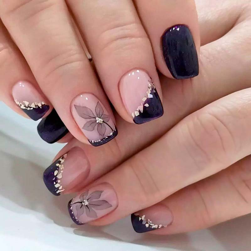 Интересно и стильно смотрится френч в темном цвете, выполненный в стиле омбре, когда зона улыбки выделена черным цветом. Довольно редкое и необычное сочетание техник.