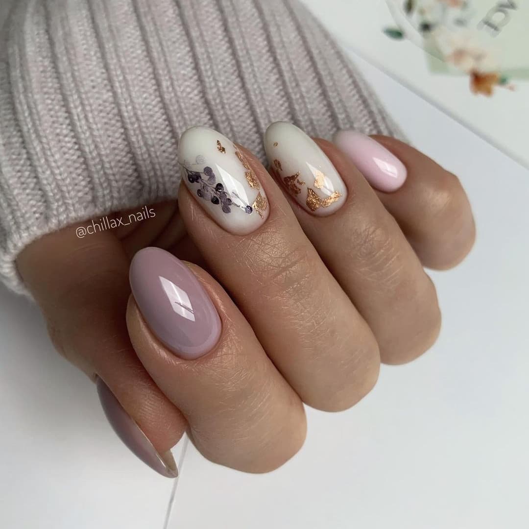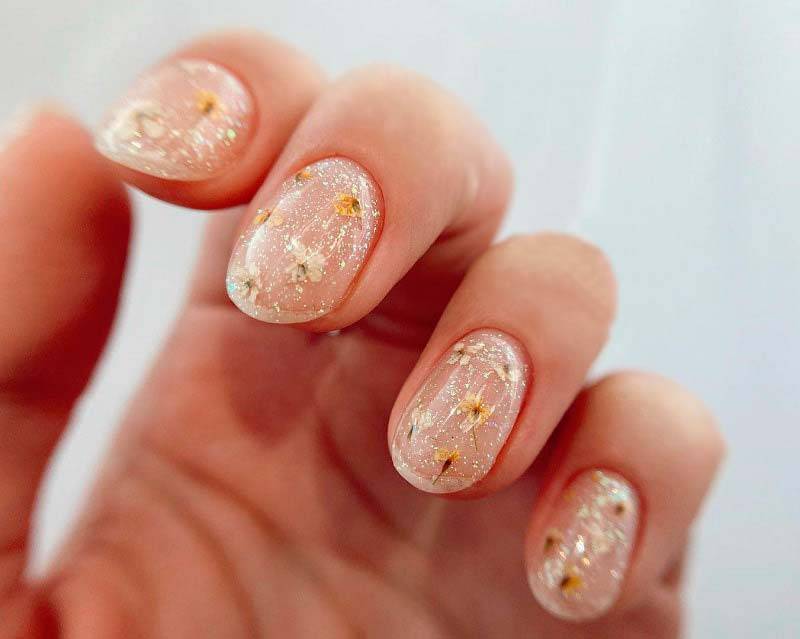 Нежный маникюр на коротких ногтях в нюдовых оттенках с сухоцветами.
