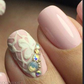 Не стоит забывать и о росписи на ноготках с естественным оттенком, которая станет «изюминкой» маникюра. Изображение мелких роз в бледных оттенках на двух ноготках в окружении светло-розового цвета будет смотреться очень женственно и изящно. Также можно использовать два лака одного тона, один из которых будет фактурный — для изображения узоров, второй глянцевый — для основы. Немного удлинить ногти поможет техника омбре с переходом одного естественного цвета к другому.