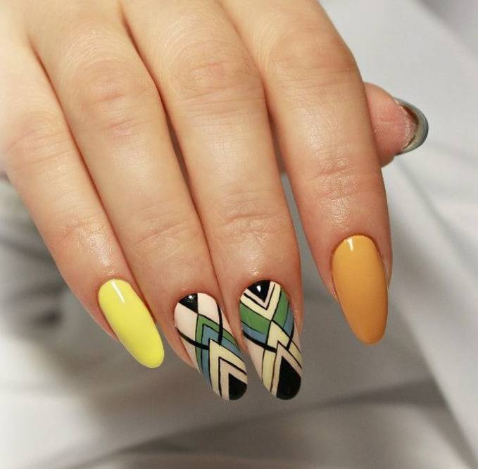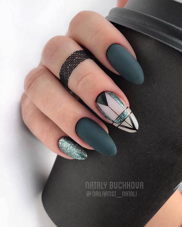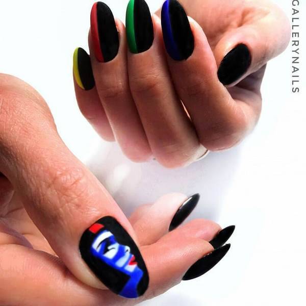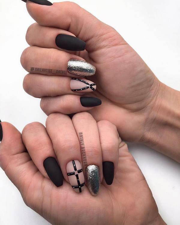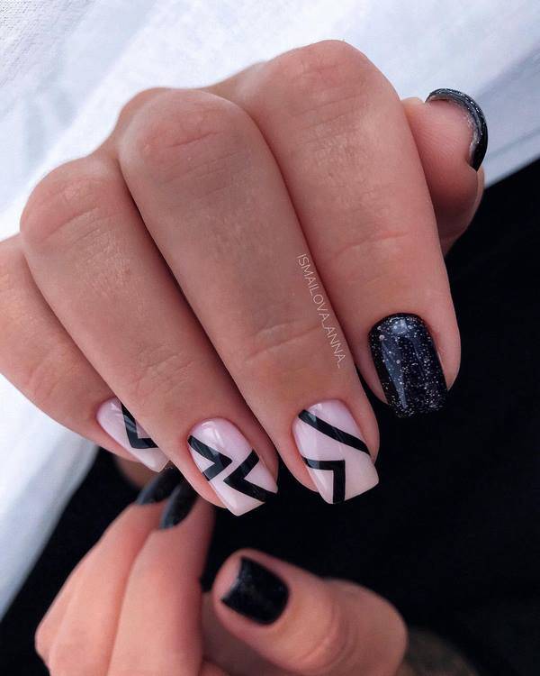 Дизайн с использованием геометрических узоров завоевал особую популярность в этом году. А все благодаря его универсальности. Ведь, используя круги, квадраты, полоски, треугольники или точки, можно выполнить, как минималистичный маникюр для офиса, так и более интересный вариант для вечернего выхода в свет. Для первого варианта прекрасно подойдет нюдовый или пастельный цвет лака для основного покрытия, а для прорисовки узоров используется черный цвет. Если вы хотите сделать более праздничный дизайн, обратитесь к блесткам, или необычной цветовой палитре. Приветствуется в геометрическом маникюре использование и других популярных техник, к примеру градиента или френча.
