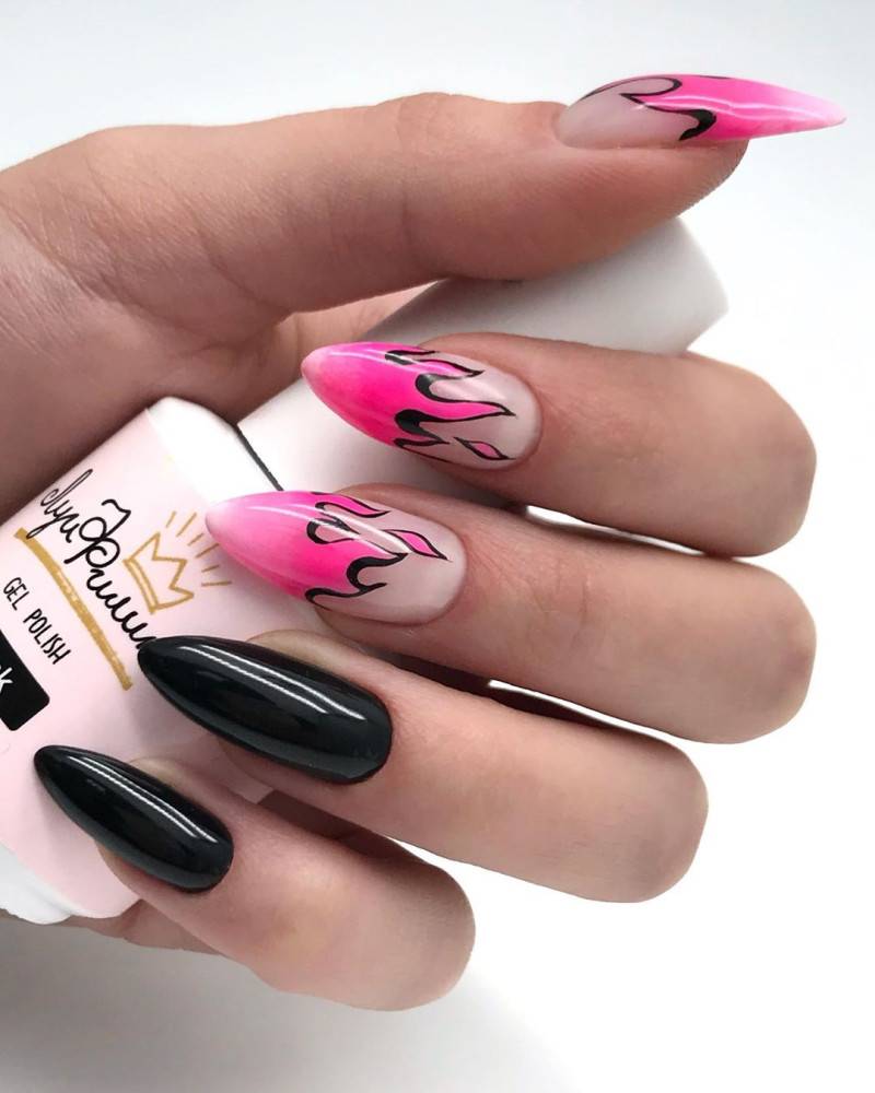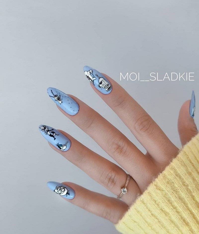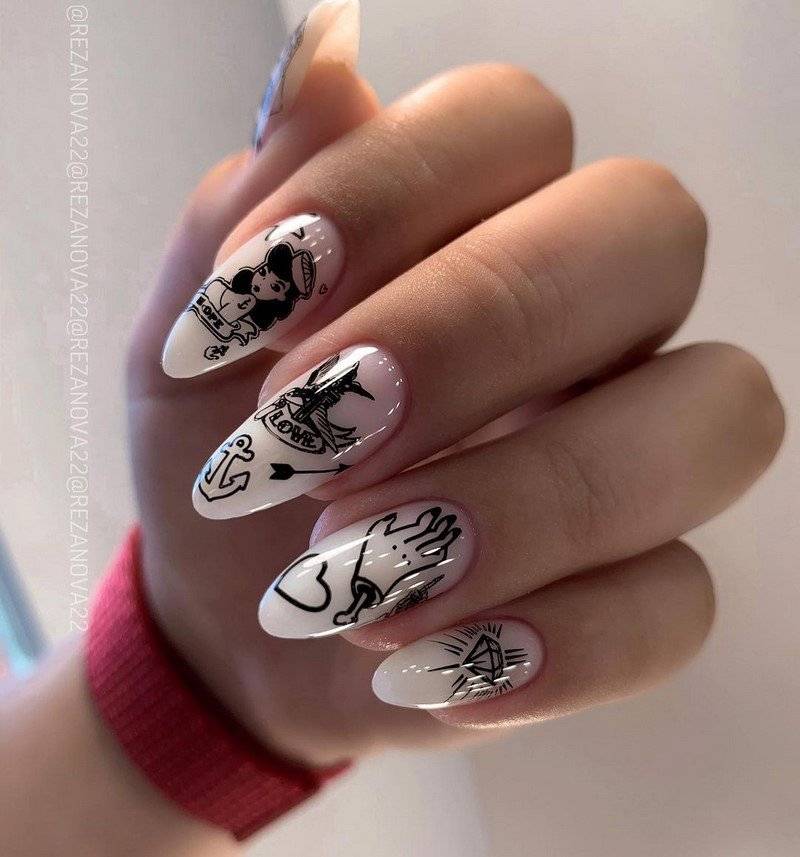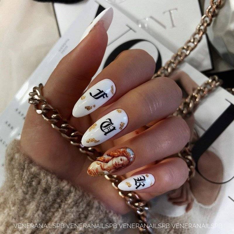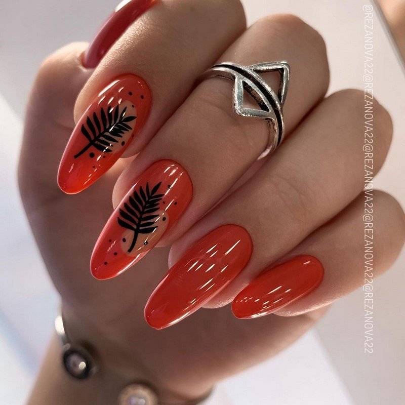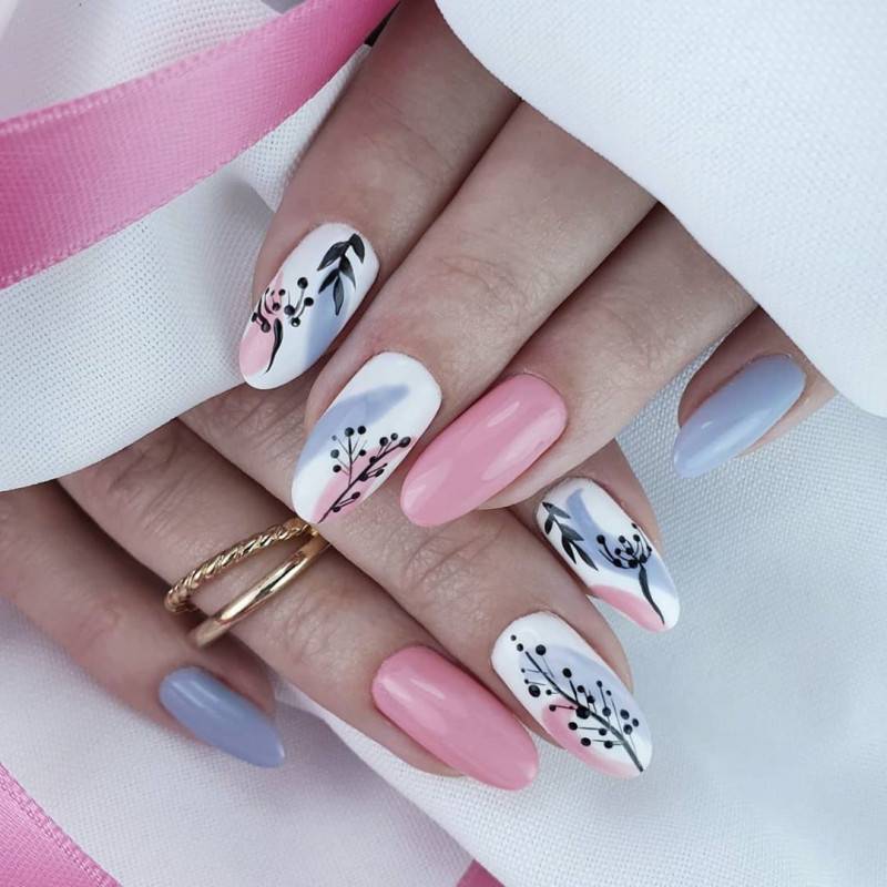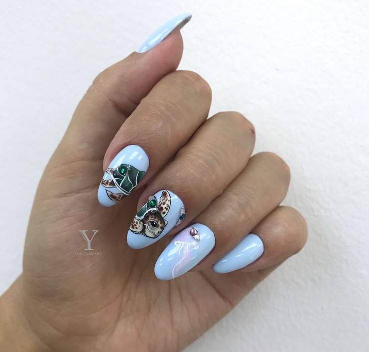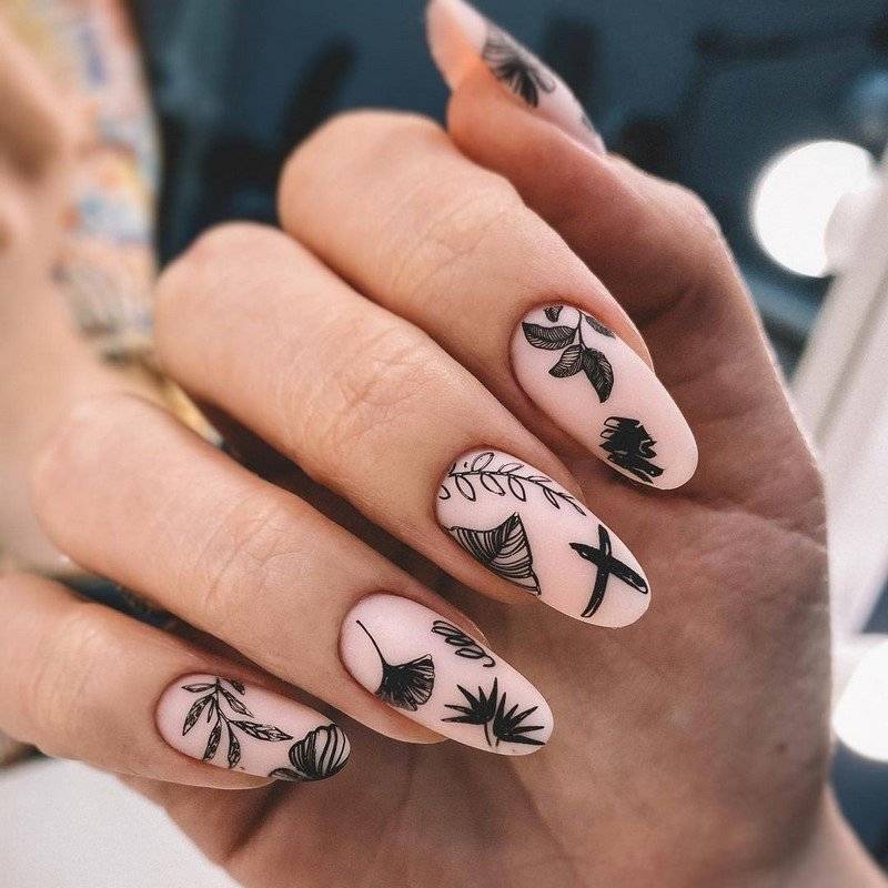 Овальная форма ноготочков, в особенности если ногтевая пластина достаточно длинная, так и располагает к тому, чтобы на нее нанести интересный рисунок. В этой области для вас открывается широкое поле для фантазии. Вы можете обратиться к флористическим мотивам, к этно, анималистичным принтам, разнообразным вензелям или абстракции.