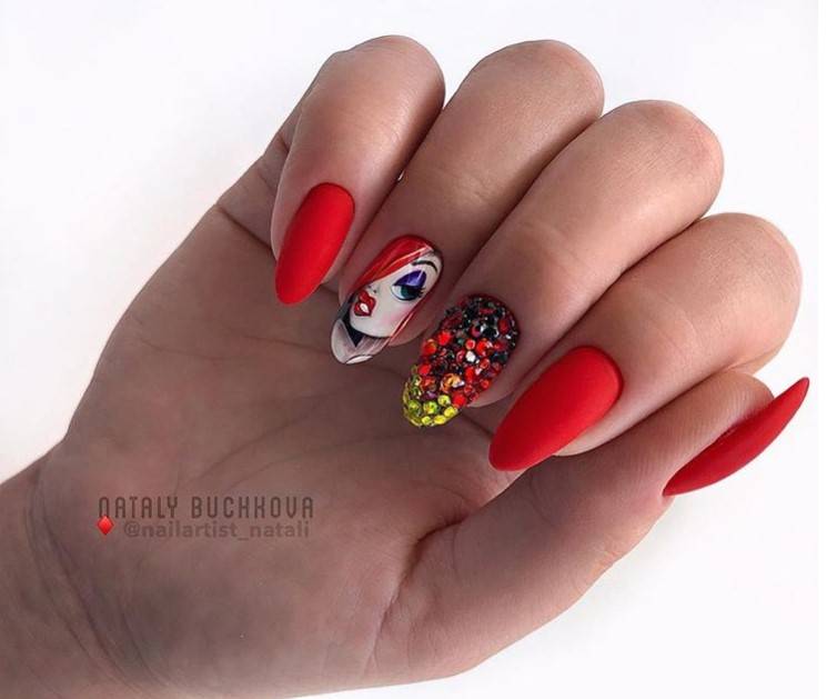 Такой маникюр наносится на белый или бесцветный лак и поражает своим шиком. Ногти в красном и черном цветах — идеальный вариант для праздничного мероприятия.