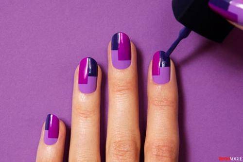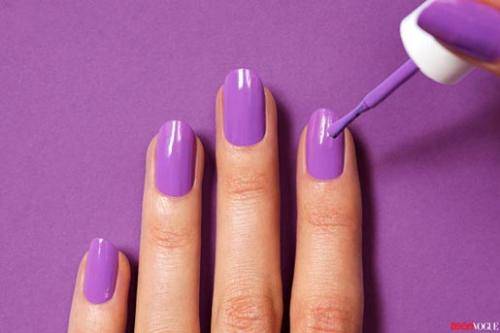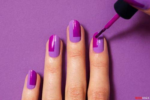 Первым делом идет самый светлый цвет. Нанесите его в два слоя, чтобы он действительно был эффектным. Используем фиолетовый лак Essie Nail Polish — Play Date. Если хотите купить такой лак, набирайте в поисковике запрос «Essie Nail Polish Play Date цена», вам откроются нужные магазины.