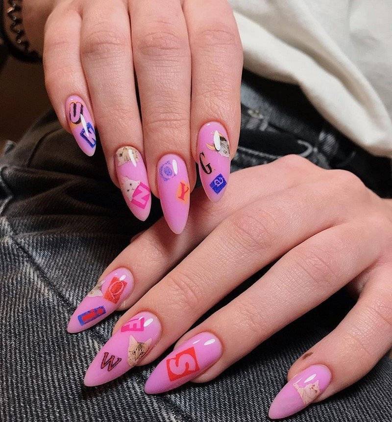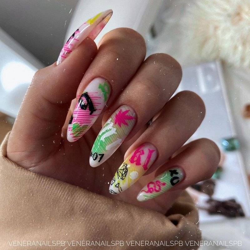 Маникюр из мрамора, бытое стекло и с деталями на мелком или крупном дизайне – все это делается на длинных ногтях, обычно в ярких тонах. Но не стоит добавлять много страз, это может быть вульгарно.