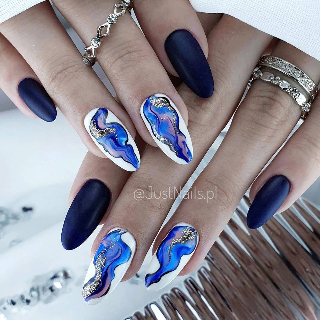 Маникюр из мрамора, бытое стекло и с деталями на мелком или крупном дизайне – все это делается на длинных ногтях, обычно в ярких тонах. Но не стоит добавлять много страз, это может быть вульгарно.