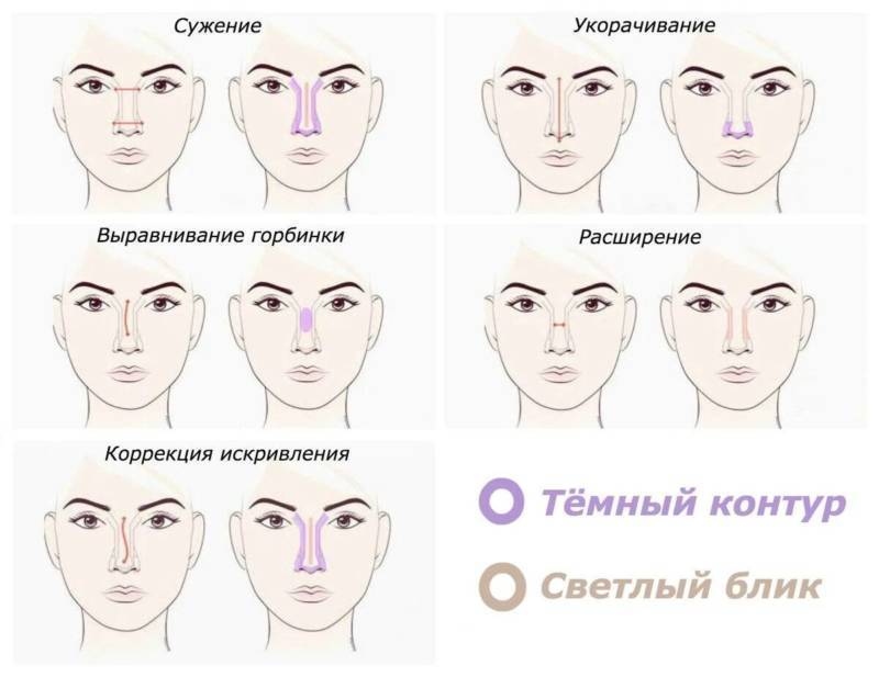 Чтобы ноздри казались более узкими, на них следует нанести темный оттенок. Если нос длинный, то затемняют кончик, а переносицу делают светлой.