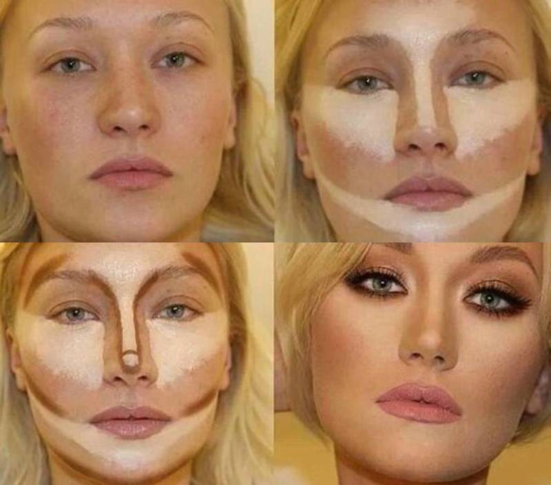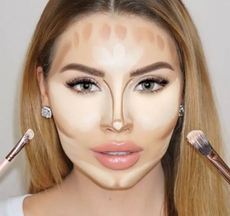 - Блондинкам можно и даже нужно выделить лицо контурингом. Темным оттенком обработайте область под скулами, боковые части лица. Светлый нанесите на все выступающие участки, подбородок, переносицу, середину лба.
