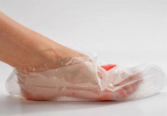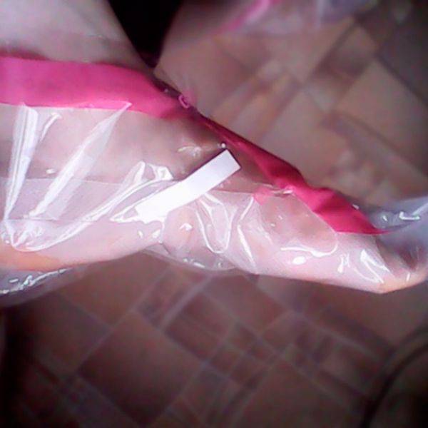Аккуратно, не допуская вытекания жидкости, надеваем носочки на стопы. Фиксируем скотчем.