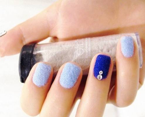 Сейчас многие девушки отказались от покрытия обычным лаком и стали покрывать ногти бархатом. Это покрытие состоит из частиц шерсти, акрила или хлопка. Подобный маникюр подойдет девушкам, которые любят находиться в центре внимания, он не требует тщательного ухода и если вы сделали это покрытие в салоне, то оно может держаться около 20 дней.