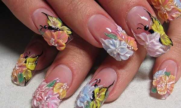 Есть и иные способы создать маникюр с 3D-эффектом. Речь идет не об акриловых цветах, которые были в моде в маникюре с десяток лет тому назад, а об объемных украшениях ногтей – мастера предлагают закреплять на поверхности лака бусины, камни, крупные стразы, фигурки разных форм и размеров. Наиболее уместный в обычной жизни вариант такого 3D-маникюра – с прозрачными полусферами, которые создают эффект капель воды на ногтях.