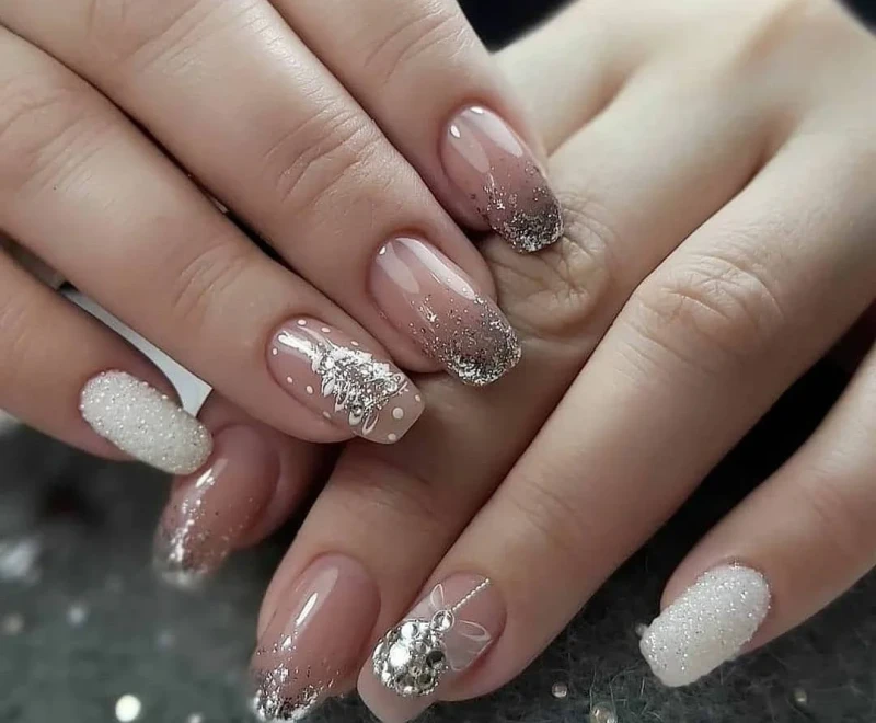 Серебристый глиттер, белые наклейки-снежинки, черная паутинка — и все вместе на нюдовой подложке выглядит нежно. Можно носить и каждый день.
