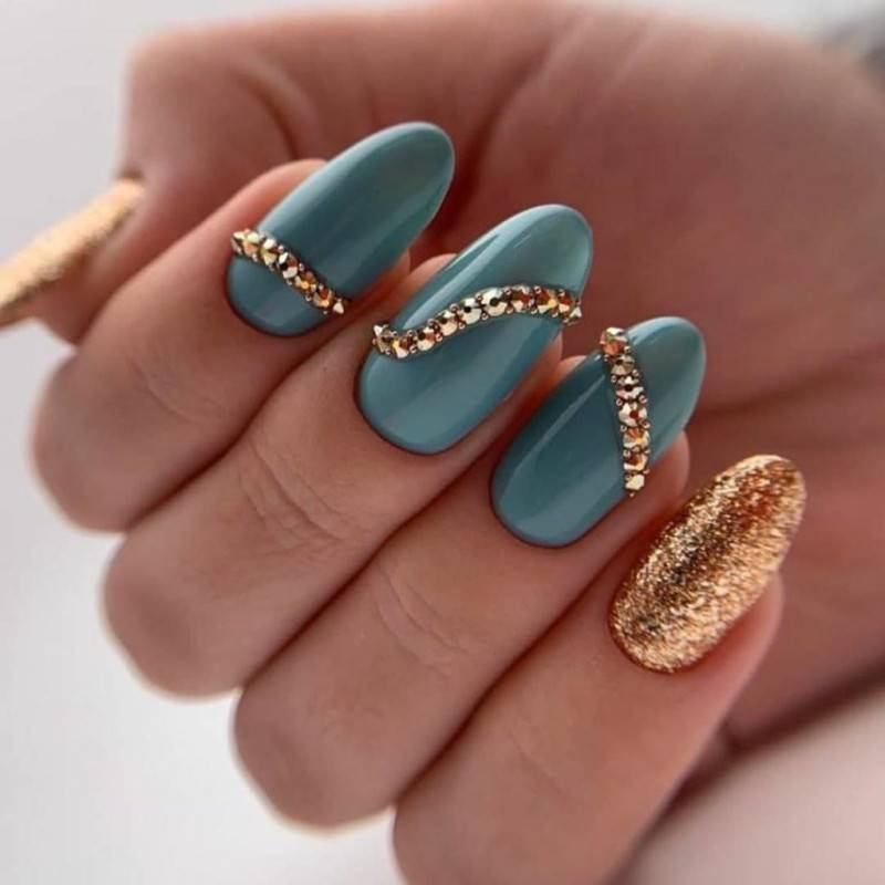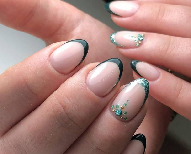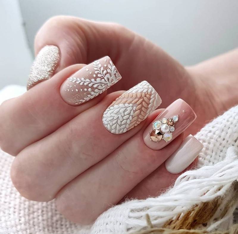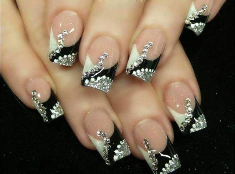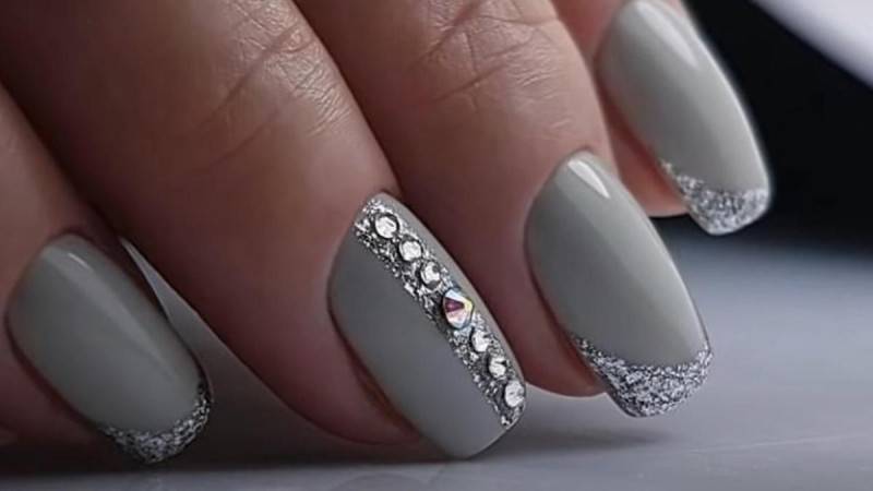 Чтобы избежать монотонности, следует выбирать маникюр с блестками, стразами и другими мелкими украшениями.