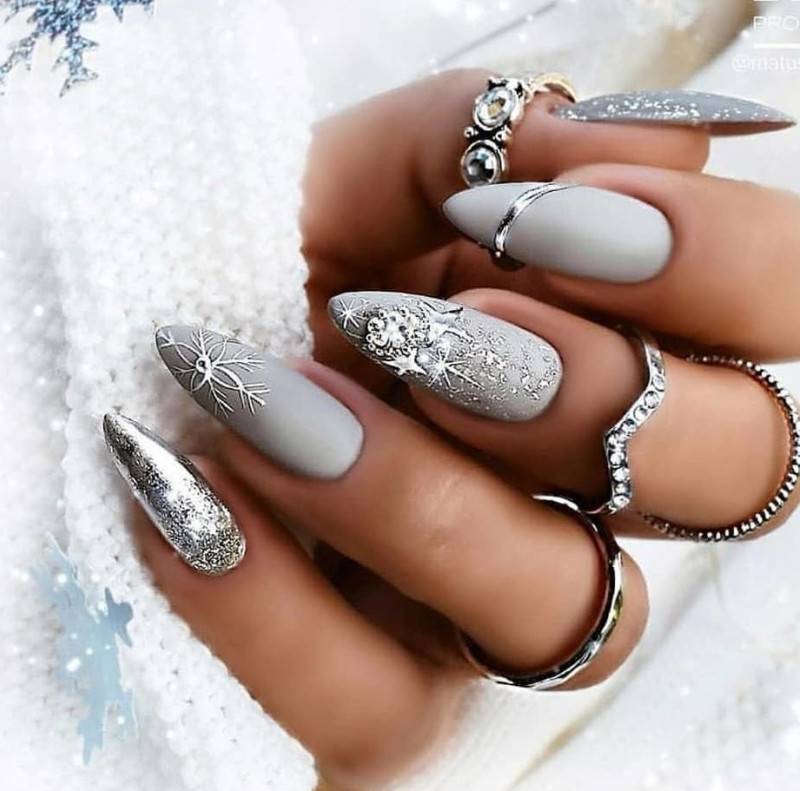 Чем только не украшают ноготки под Новый год! Тематические рисунки по типу елочек, снеговиков и снежинок, обильно усеянные блесточками и стразами, сверкают ярче, чем праздничная елка.