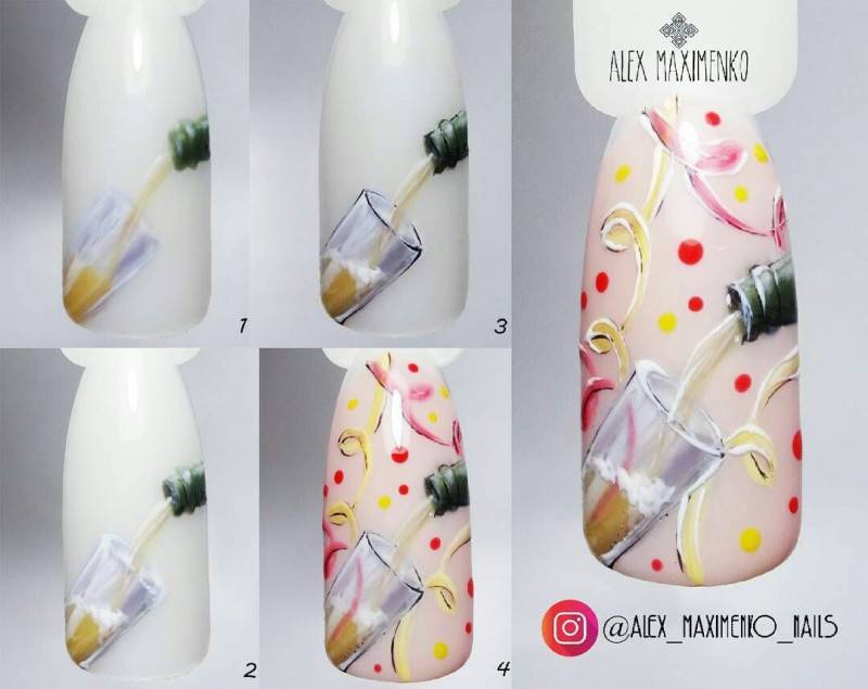 Бокал рисуется тонкой кистью и заполняется базой, смешанной с золотыми или серебряными блестками. Дизайн можно комбинировать с различными втирками, хлопьями юки или гель-лаком с блестками.