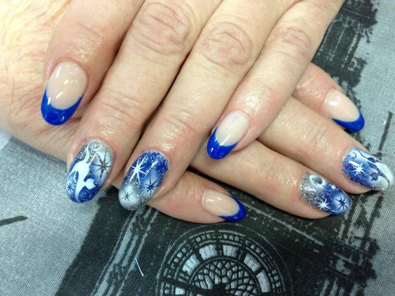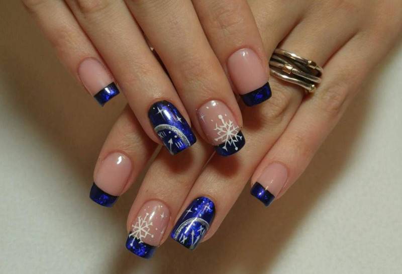 Отдельно выделим густой синий. Такой лак обязательно должен быть в арсенале модницы этой зимой. И для новогоднего маникюра можно выбрать синий цвет в качестве основного. На синем фоне эффектно смотрятся новогодние блестящие шарики, конфеты, елочные лапы и другие атрибуты праздника.