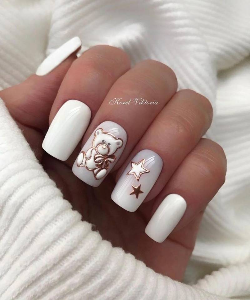 Именно с этим цветом ассоциируется зима. Так почему бы не почтить его столь логичным решением? Белый маникюр может быть каким угодно. Вы можете выбрать белый фон с праздничными узорами, либо нанести его элементы на другие оттенки лака.