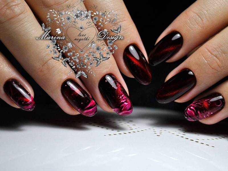 С помощью магнитных гель-лаков получается интересный рисунок, который напоминает камень хризоберилл. Что интересно, такой маникюр не требует дополнительных украшений, так как и в одиночном исполнении, он выглядит бесподобно.