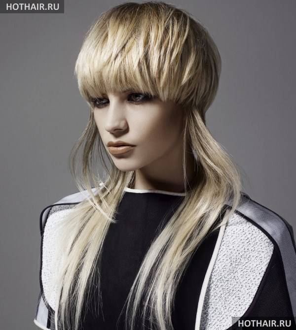 Чёлка углом может быть длинной и короткой, с ровными или рваными краями. Подходит модель к волосам разной длины и ко всем типам лица, кроме вытянутого.