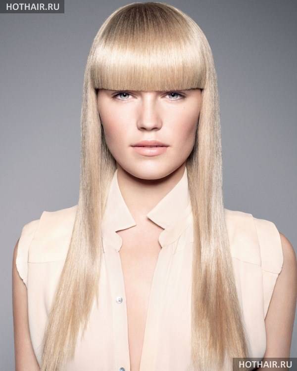 Такая модель отличается простотой и пользуется популярностью у многих девушек. Очень идёт круглолицым, подобно занавесу скрывая недостатки и зрительно удлиняя лицо.