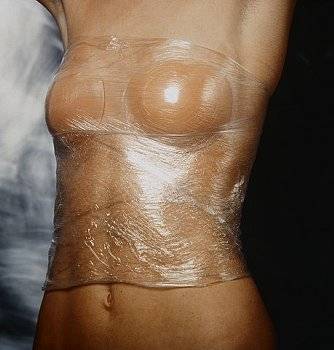 Далее сухие области тела, признанные подлежащими исправлению, обрабатываются собственноручно изготовленным составом. Следующий шаг – оборачивание себя в пленку, но не впритык, а с запасом примерно 3 – 4 слоя, ведь состав не должен подтекать.