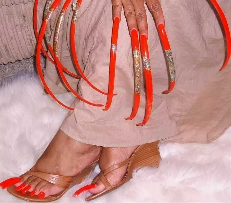 - Зачем были нужны такие длинные ногти? «Я очень хотела, чтобы мой маникюр был здоровым, и я решила понаблюдать, насколько длинными ногти могут быть, пока не изменят направление роста. Но пластинки не поменяли своего направления до сих пор».