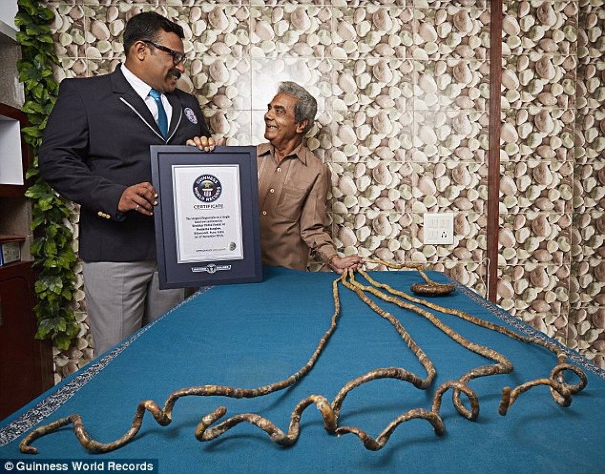 Еще один человек, который очень щепетильно относится к собственным рукам – это Шридхар Чилал. Мужчина появился на свет в Индии в 1938 году. И уже в возрасте 14-ти лет он решил, что не будет стричь ногти на одной руке, а будет их отращивать. За долгие годы ногти выросли до ошеломляющих размеров. Так самый длинный ноготь уже вырос до 130 сантиметров. А суммарная длина ногтей с пяти пальцев равняется 6,2 метрам. Своим рекордом индус гордится, правда признается, что предмет гордости доставил ему немало проблем. Со временем они начали деформироваться, а из-за избыточного веса левой руки нервы на левой стороне были повреждены. В итоге мужчина оглох на левое ухо. Чтобы избежать неприятностей со здоровьем Шридхар обстриг ногти в 2000 году. Но оставил их на память. Теперь он только берет их собой на различные мероприятия, к примеру, местные ток-шоу.