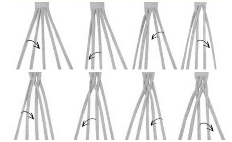 - Положите заготовку перед собой так, чтобы сшитые концы были сверху. Теперь по схеме на фото плетем наш будущий аксессуар.