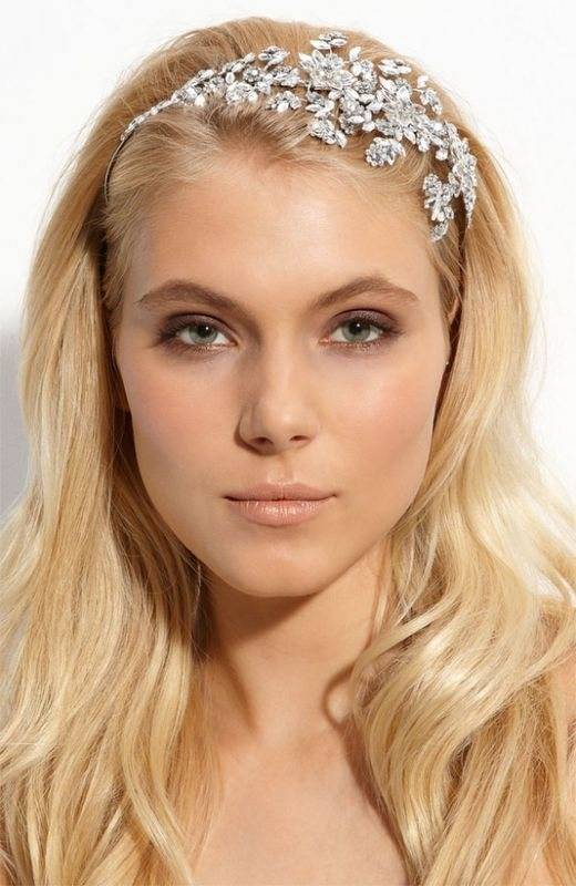 Греческая прическа, декорированная тонким ободком с цветком, дополнит образ блондинки с длинными волосами и макияжем в светло-коричневой гамме
