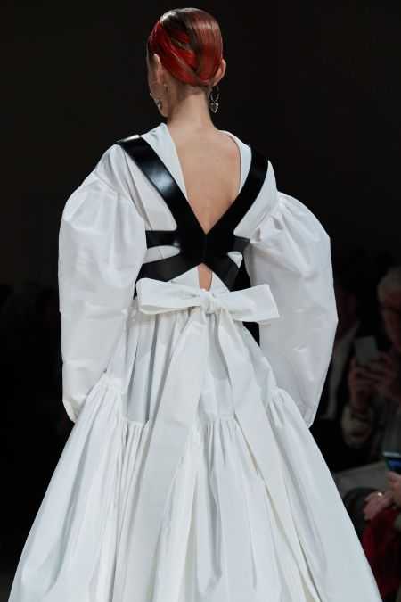 Черная портупея поверх белого пышного платья Alexander McQueen