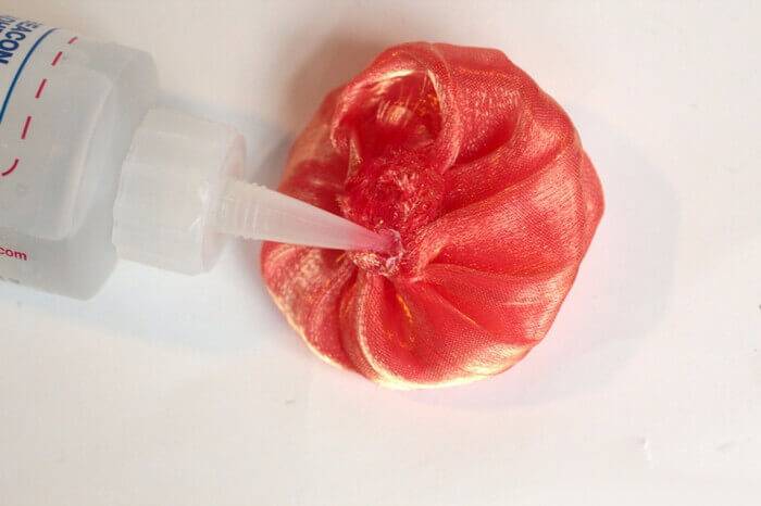 Наносим на основу цветка клей и приклеиваем к тканевой основе.