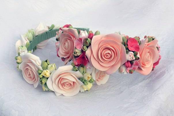 - за основу берется тонкий металлический или пластмассовый обруч и декорируется с помощью рукотворных цветов, лент, граненых бусин из стекла, самоцветов и сверкающих страз;