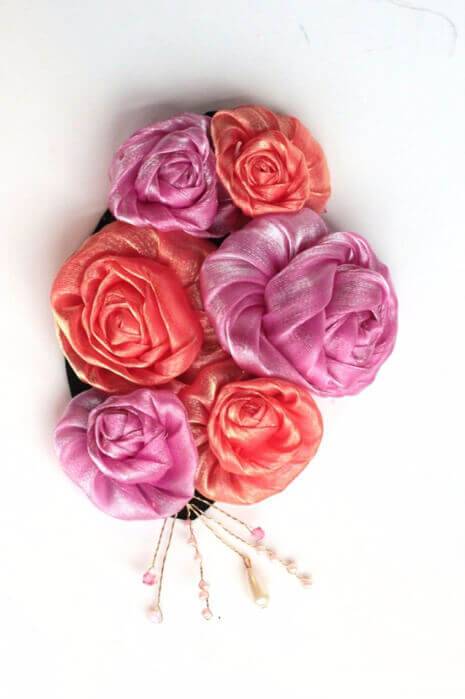 - Изготовленные из шифоновой ткани бутоны пионов или роз аккуратно соединяются с помощью клея и фиксируются на ободке. По желанию композиция декорируется бусинками. В качестве цветов из шифона можно использовать искусственные аналоги.