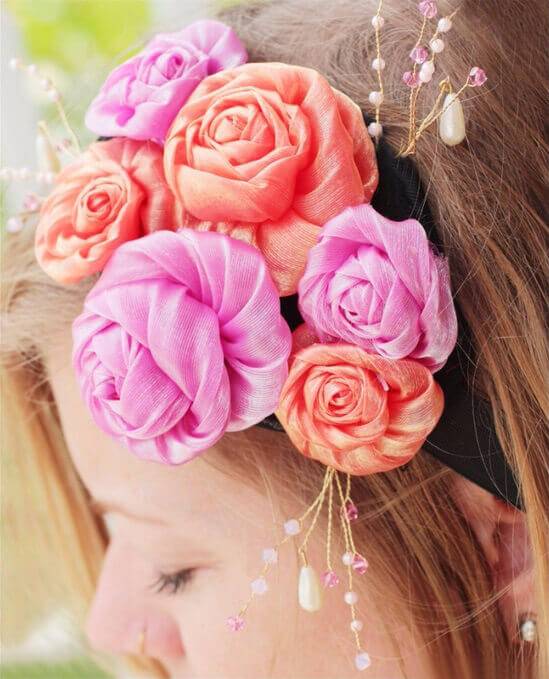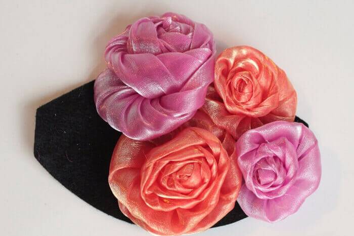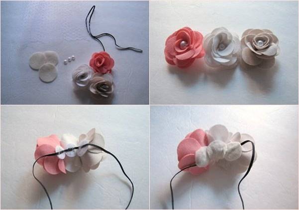 Делаем цветы из лент, органзы, или любой ткани своими руками. Располагаем цветы на повязке.