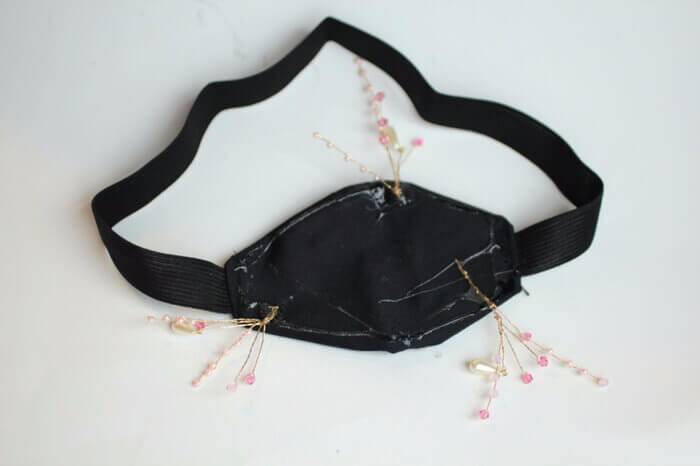 Изготовив декоративную часть по собственному вкусу аккуратно пришиваем её к основе и производим украшение бусинами, стразами и другими элементами.