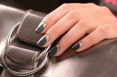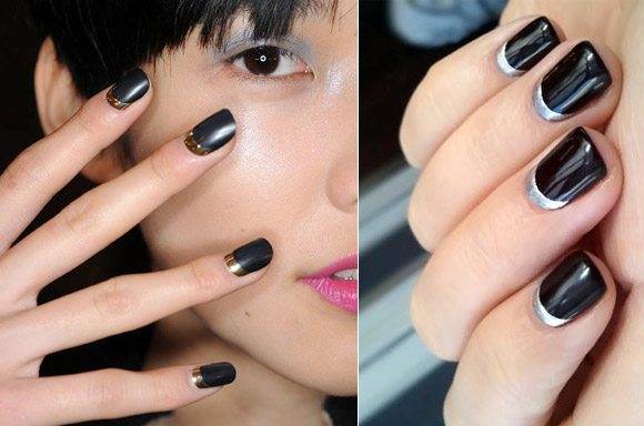 В качестве контраста у основания ногтя, можно взять черный лак и нанести небольшое количество у основания ногтевой платины, растянув вниз. Мастера не рекомендуют наносить лак мазками — тогда полоска получается не ровной и не равномерной, маникюр будет выглядеть неаккуратно.