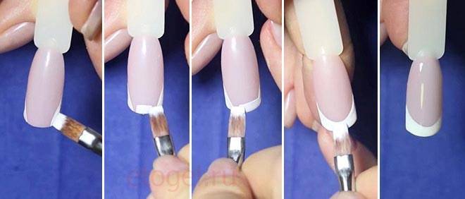 Что же нужно делать? Изначально покрываем пластину базовым, розовым лаком. Когда он высохнет, возьмите скошенную (тонкую) кисть и мокните ее в лак, отодвигая околоногтевые валики пальцем, прокрасьте область свободного края. «Недочеты» убираем ватной палочкой с ацетоном. Далее, проводим процесс нанесения финиша.