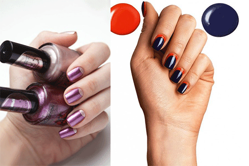 - Смелые металлические оттенки с сочными цветами. К примеру, кромку можно сделать золотой или серебристой, а на остальную часть ногтя нанести розовый, черный и прочие цвета лака.