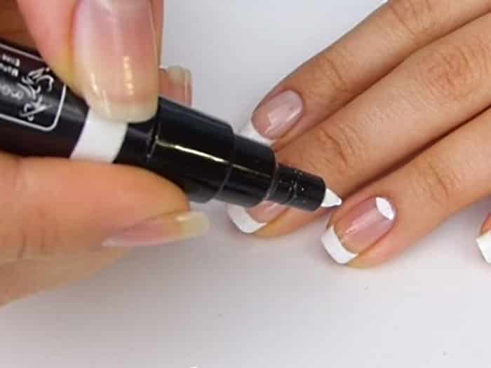 Покрываем свободный край белым лаком (если же подтеков избежать не удалось, применяя скошенную, промоченную в ацетоне кисть удаляем все «погрешности»), затем создаем покрытие основы и вскрываем все финишем. Применяем данный способ, чтобы сделать френч на нарощенных ногтях.