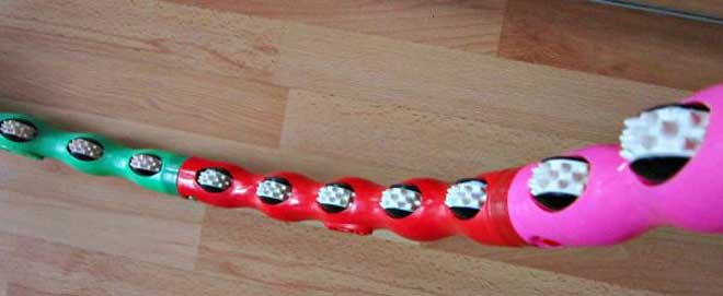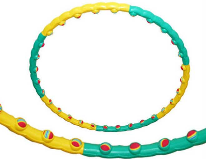 - Массажный обруч. На обратной стороне хулахупа, той, что непосредственно соприкасается с телом, присутствуют выпуклости или подвижные ролики. Во время тренировки они массируют зону талии, улучшая кровообращение в этой области и активизируя сжигание жира. Продвинутые версии такого хулахупа снабжаются счетчиком. Он фиксирует количество и интенсивность вращений, число израсходованных калорий, рассчитывает оптимальную продолжительность тренировок.