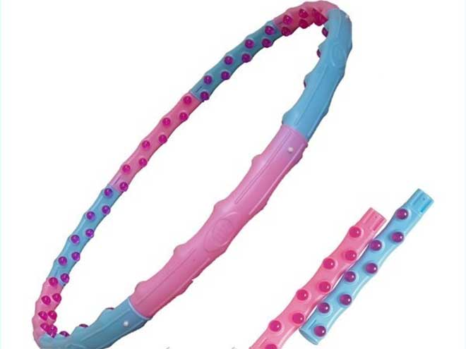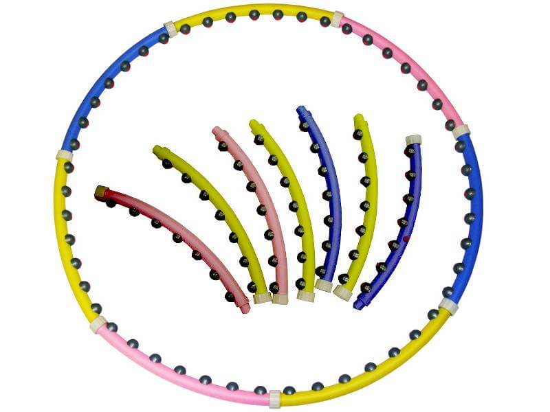Купить массажный обруч хулахуп выгодно еще и потому, что он подходит для любой комплекции и роста человека. Конструкция разборная, продумана таким образом, что при необходимости можно управлять нагрузками: добавить секции, магниты, массажные элементы, по 2 штуки на каждую деталь. Это универсальный тренажер, цена приблизительно 50$.