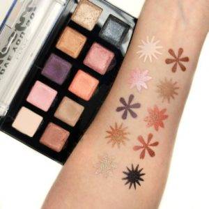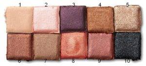 The product contains 10 eyeshadows, the majority of which are shimmery. There is only one matte for a neutral color. The rest of them are funky, like peach, coral, tans, purple, yellow, bronze, brown and black. The eyeshadows do not have names for their own. They are numbered from left to right, you can check at the bottom of the palette.