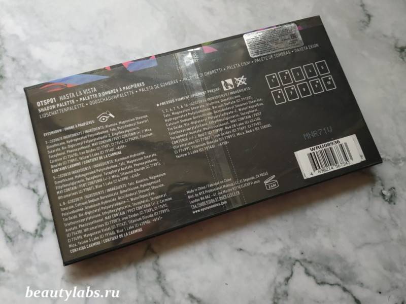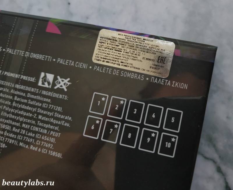 На обратной стороне упаковки можно увидеть название палитры, узнать срок годности и ознакомиться с основной информацией. Срок годности после вскрытия составляет всего шесть месяцев. Понятное дело, что за такой короткий срок воспользоваться тенями полностью практически невозможно.