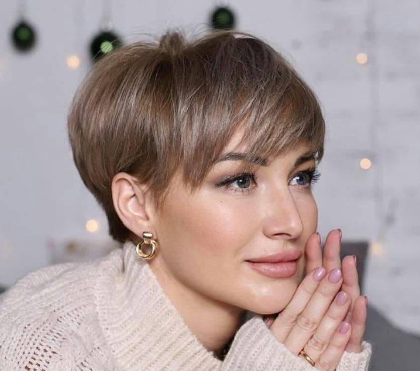 Стрижка пикси сезона 2024 — стильная и женственная, тип стрижки подбирается в соответствии с формой лица и типом волос. Это многослойная челка с прядями разной длины и короткими волосами на затылке и висках.