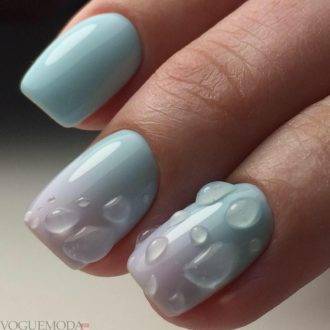 Особой нежностью на руках обладает эффект градиента. В основном используют светлые оттенки. Аккуратно исполненная растяжка добавляет рукам настоящую утонченность. Этот вариант отлично дополняют тонкими веточками, цветами, фольгой или блеском.