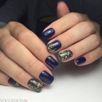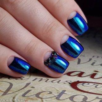 Рассматривая модные блоги бьюти – мастеров, можно сделать вывод, что зимой 2020 пальму первенства перехватит глубокий синий цвет. Его можно будет сочетать с серебристыми или золотистыми узорами, стразами или бусинками.