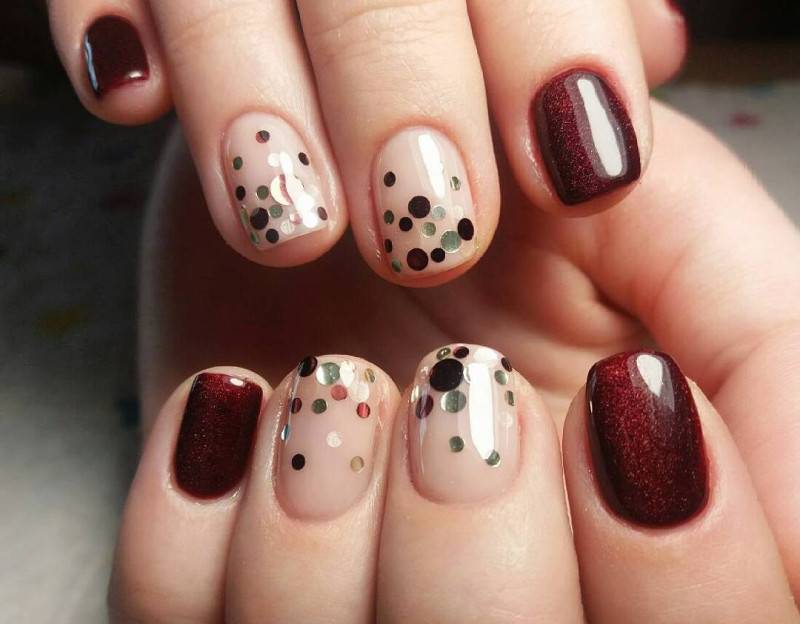 Этот вариант создают с помощью круглых плоских чешуек. Их располагают по всей длине ногтевой пластины или выборочно. Нередко этот материал сравнивают с паетками или конфетти, а ведь они действительно очень похожи, особенно на фото.