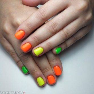 Однако, возможно, чрезмерно экстравагантный цветной маникюр будет слишком эпатажным для повседневной жизни. Вариантов сочетаний может быть масса – желтый и оранжевый, красный и черный и так далее.