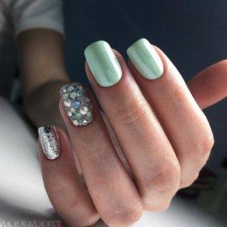 Море блесток, конечно же, станет идеальным вариантом для праздничного маникюра. Стразы могут быть совершенно разного размера и разного оттенка. Выложить их можно в интересную композицию, или же рассыпать в хаотичном порядке.