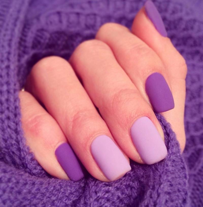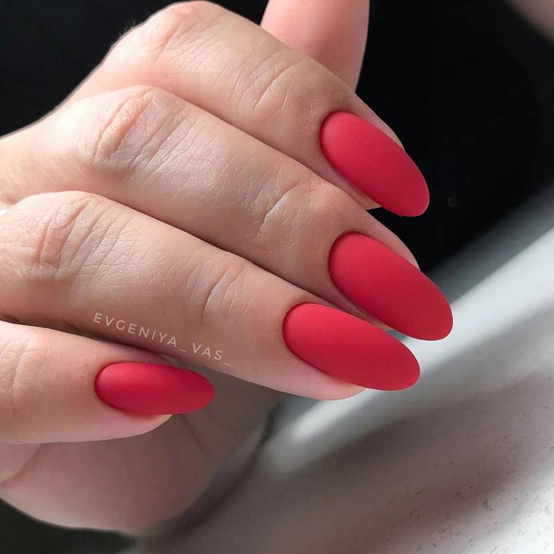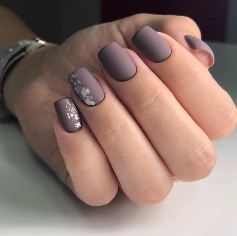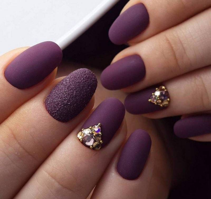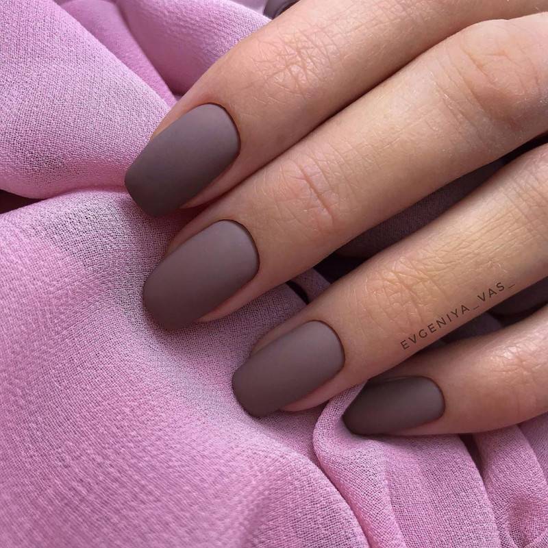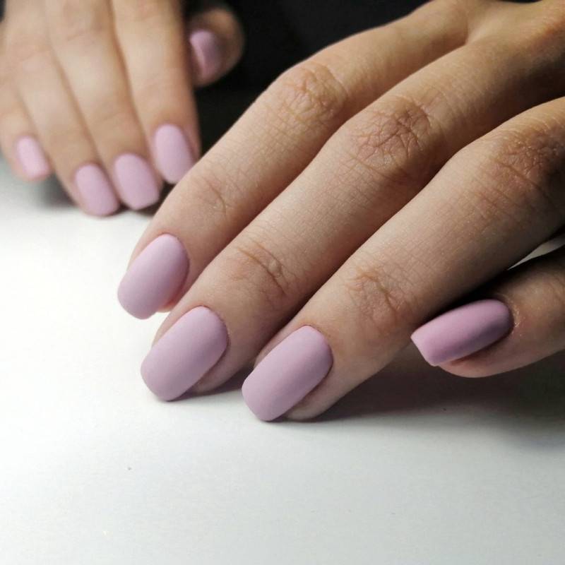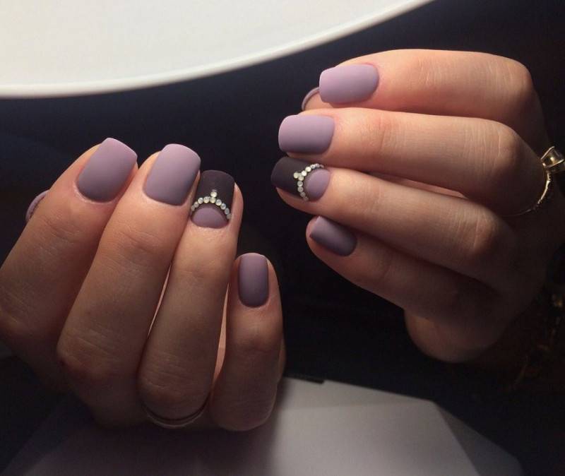 Однотонное покрытие гель-лаком с матовым финишем выглядит благородно и оригинально. Этот вариант одинаково хорош как для светлого, так и для темного покрытия. Разнообразить маникюр помогут стразы, блестки, камифубуки, комбинации с глянцевым покрытием.
