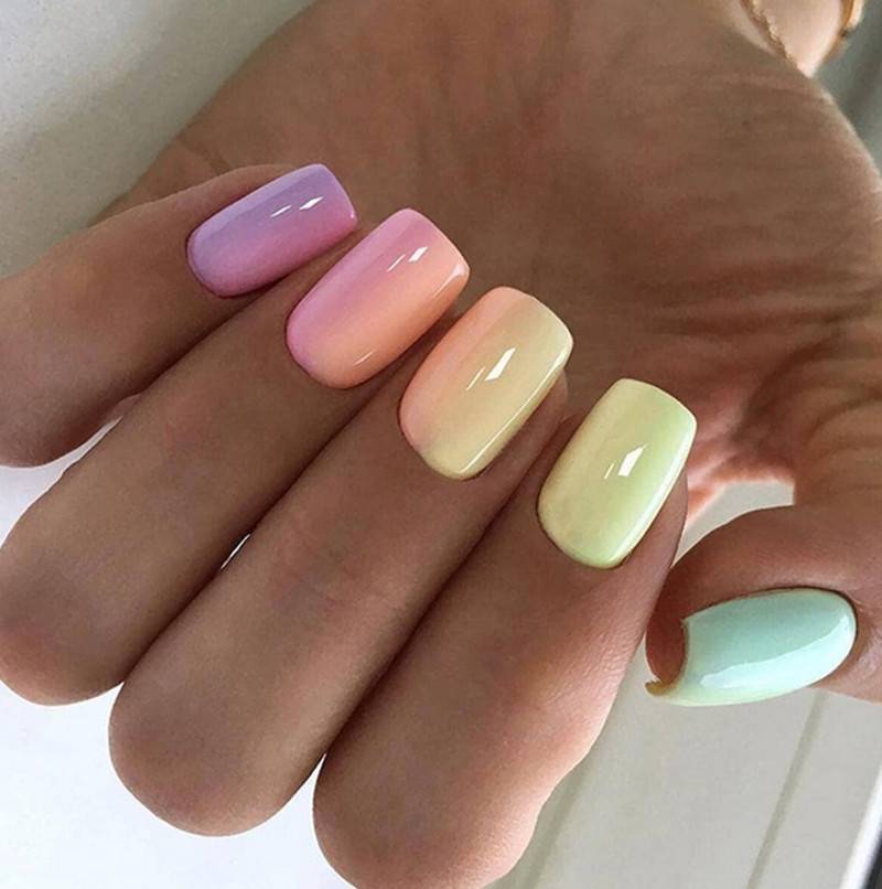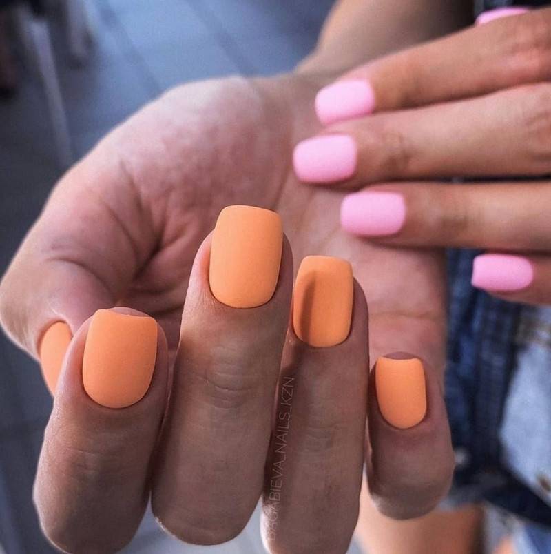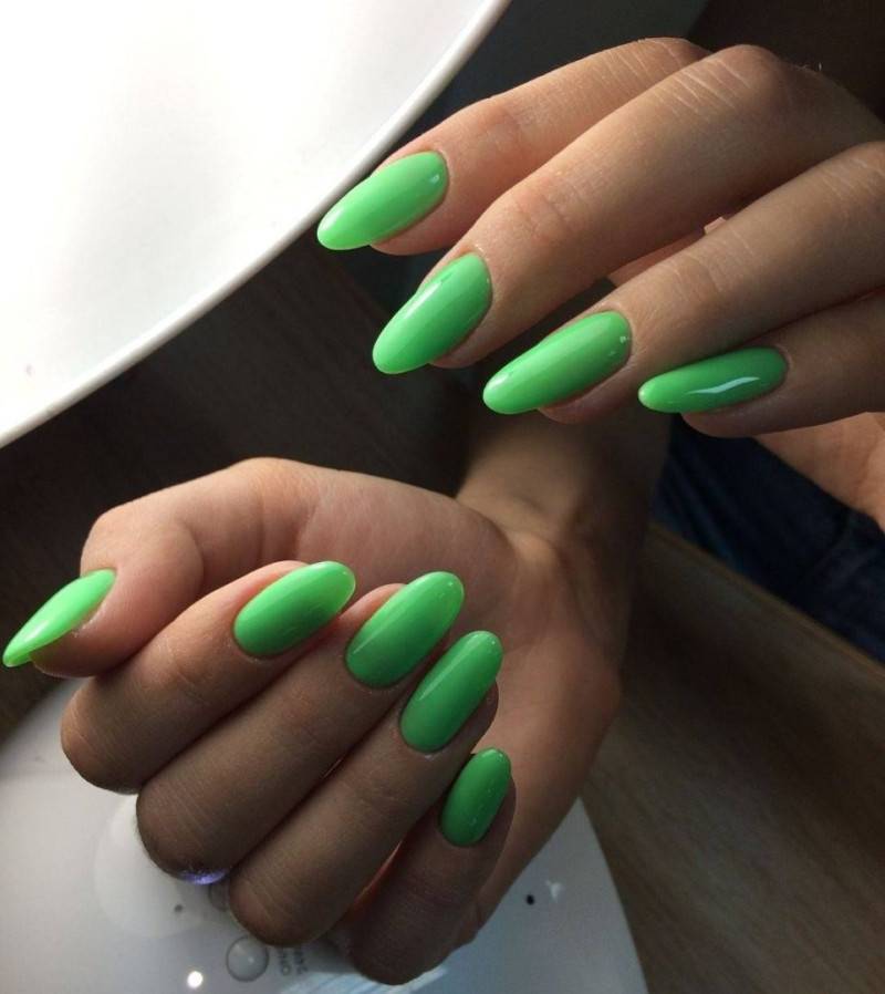 для монохромного маникюра, помимо пастельной цветовой палитры, можно использовать такие оттенки как матовый зеленый, желтый, оранжевый, индиго и другие
